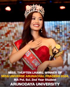 Miss Thupten Lhamu, MA Political Science 2nd Year student, for securing the crown of Miss Universe Arunachal Pradesh 2024.